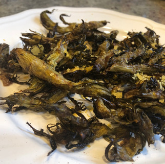 And indeed it did. Raw Knotweed has a somewhat slimy texture like okra (politely called “mucilaginous.”) Roasting/broiling the greens under high heat, with a little olive oil and salt and pepper until they were fairly charred, really helped offset the lemony/ sliminess with crispness and “umami-ness.” Serve them right away out of the oven though—this recipe only remains “restaurant quality” for a few minutes.